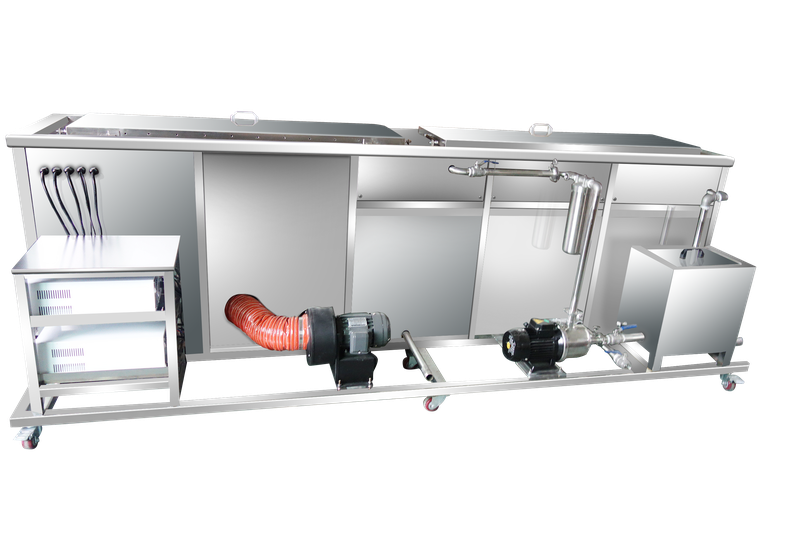 Our multi tank ultrasonic cleaning systems combined with the hot air dryer can be used as an effective part cleaning line by housing heated cleaning solution, cascading DI rinse water, and a final cascading DI rinse water with a final hot air dry step. The process would move from left to right: the parts would be cleaned, rinsed, rinsed and then dried.